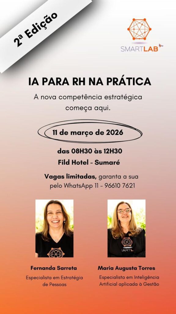 No dia 11 de março, das 8h30 às 12h30, o Smartlab – Ecossistema Integrado de Gestão 360º promove em Sumaré, cidade do interior do Estado de São Paulo, a 2ª edição da imersão presencial “IA para RH na Prática”, que será realizada no Fildi hotel & eventos. A Inteligência Artificial já está transformando a forma como as empresas tomam decisões — e o setor de Recursos Humanos está no centro dessa mudança.