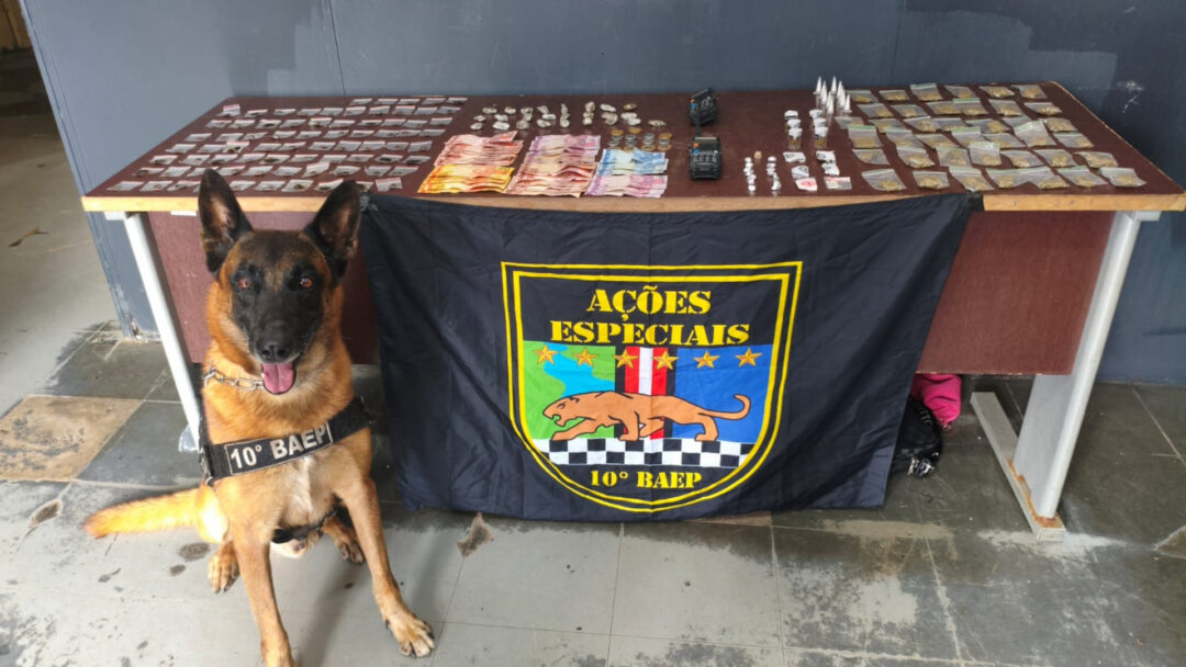 Com o menor, foi encontrada uma sacola plástica contendo dinheiro e diversas substâncias ilícitas. O adolescente admitiu às autoridades que estava envolvido na venda dos entorpecentes desde as primeiras horas da manhã. Para ampliar o alcance da busca, o cão farejador Yran, da Polícia Militar, foi acionado e rapidamente localizou uma segunda sacola, escondida na rota de fuga do suspeito, duplicando a quantidade de drogas apreendidas.