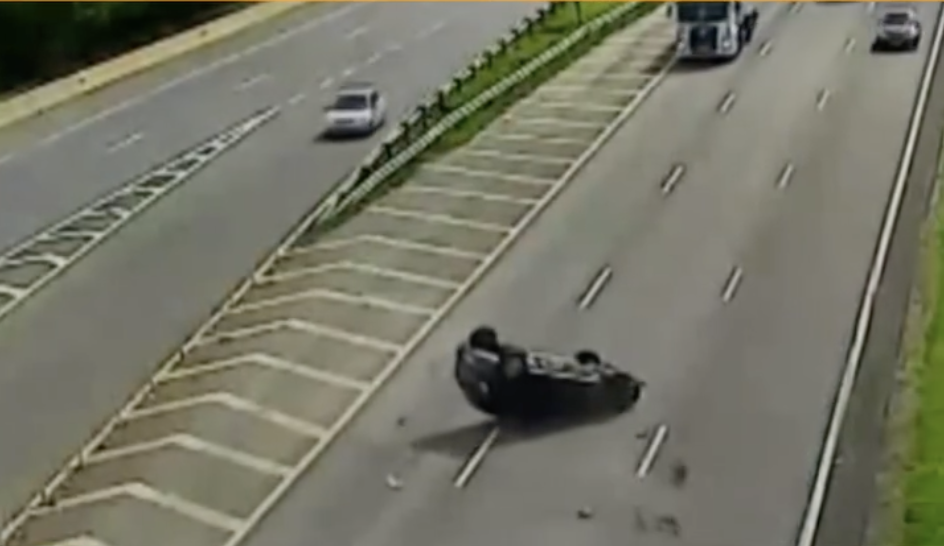 O capotamento foi registrado por câmeras de segurança da concessionária Rota das Bandeiras, responsável pela administração da via. Nas imagens, é possível ver o momento em que um carro preto tenta acessar a pista principal e acaba sendo atingido na traseira por um veículo branco, que vinha em alta velocidade.